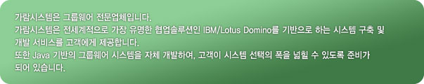 Lotus Domino 및 Java 기반의 전자메일, 전자결재, 지식관리 등 기업의 정보 시스템을 구축해 드립니다. 기존에 운영중인 시스템의 프로세스 개선 및 기능향상을 위한 단위 모듈 개발 서비스를 제공합니다 기존에 운영중인 시스템의 속도 및 안정성을 확보하실 수 있도록 운영시스템 분석 서비스 를 제공합니다 업무개선에 도움이 되는 아이디어를 시스템화 하여 고객의 실정에 맞는 시스템을 개발해 드립니다 기업의 정보화를 위한 인프라 구축 서비스를 제공합니다.